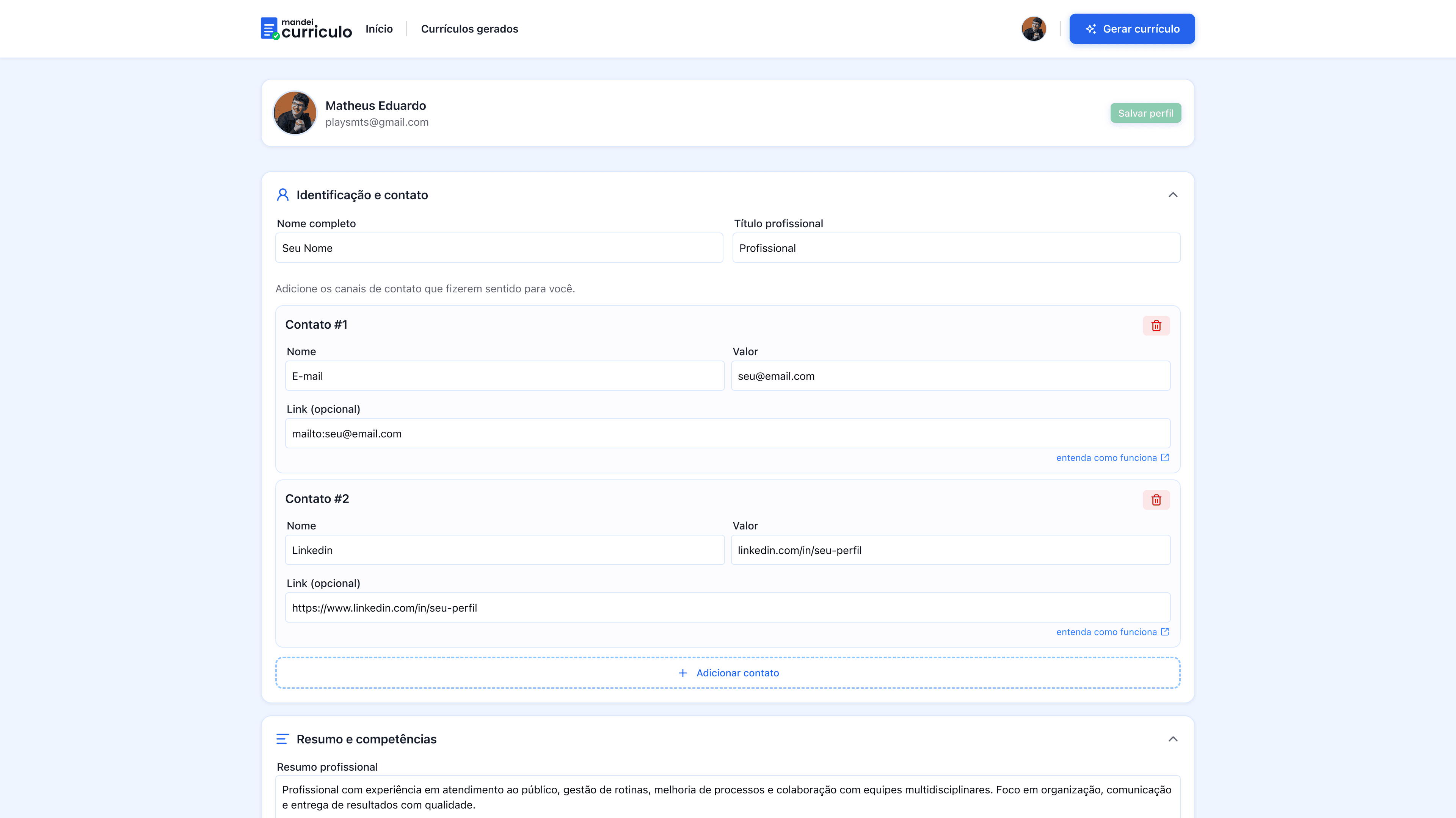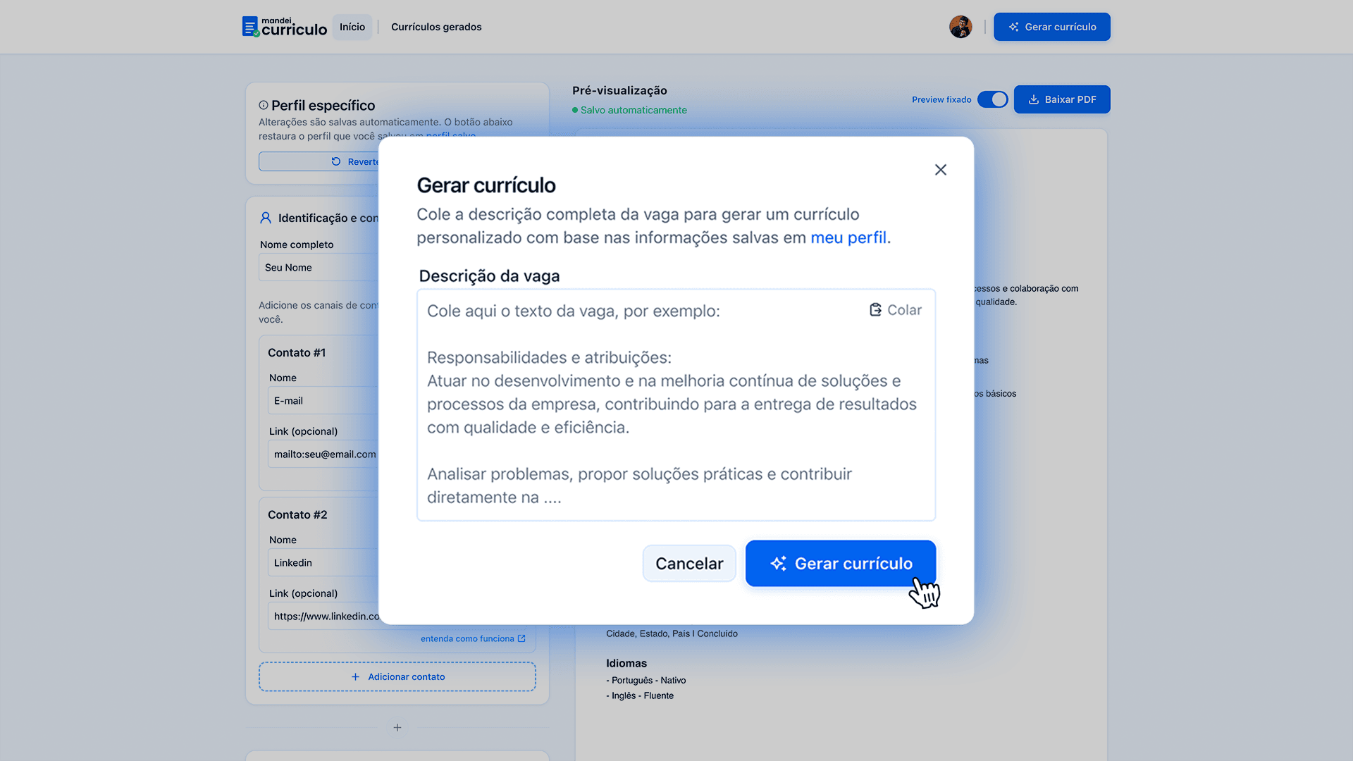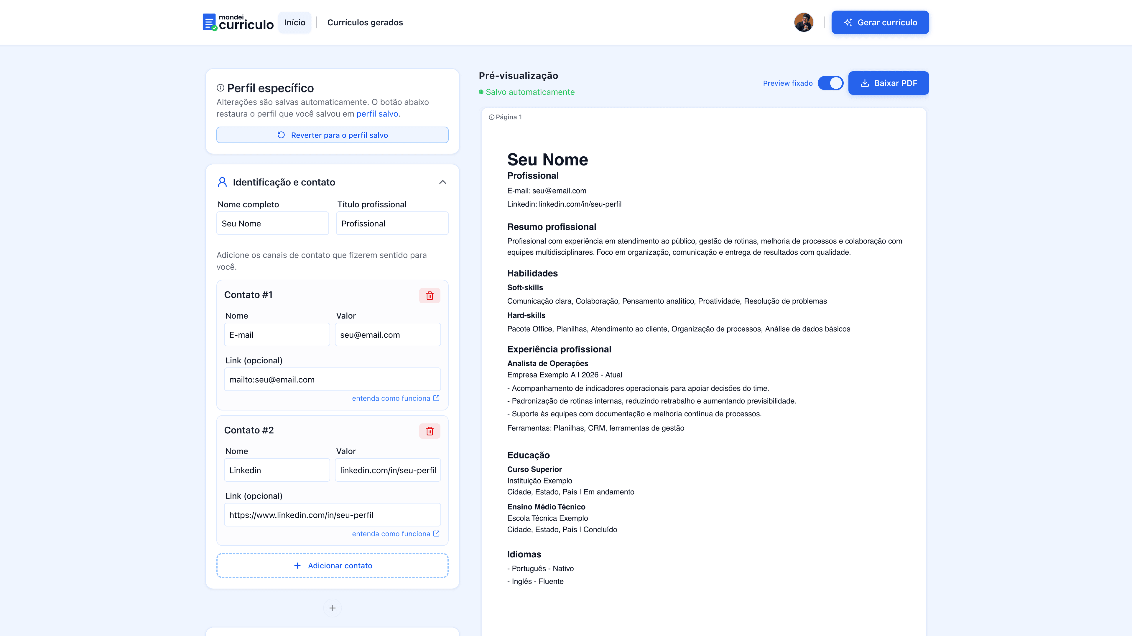 Edite seus dados, acompanhe o resultado em tempo real e exporte um PDF profissional sem precisar alternar entre várias telas.